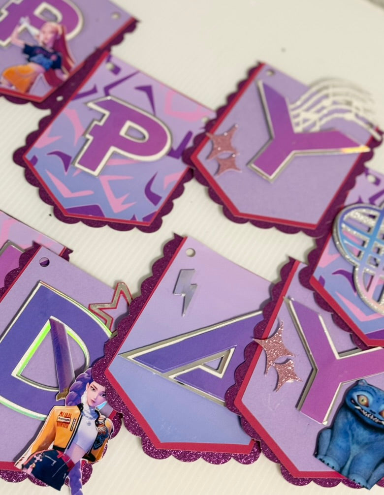 • Bring your party to life with this Huntrix / Demon Hunter Birthday Banner, designed in bold purples, glitter accents, and holographic layers for the perfect aesthetic.