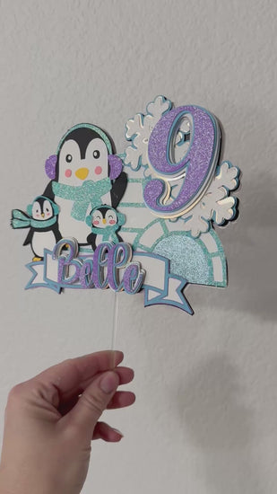Make your child’s winter birthday extra magical with this adorable penguin-themed cake topper! Handmade with layered glitter cardstock, this topper features a cozy penguin family, sparkling snowflakes, and an igloo backdrop. Personalized with your child’s name and age, it’s the perfect finishing touch for winter wonderland parties, Christmas birthdays, or any chilly celebration.